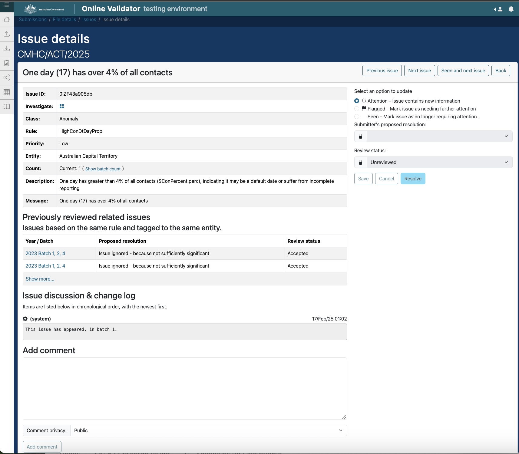 The purpose of the Review is to identify, and explain or rectify inconsistent, anomalous and exceptional issues. During this process the Submitter and Reviewer may assign control over the list of issues to each other as many times as necessary. Assigning control in this manner prevents the Reviewer and Submitter from having write access simultaneously, maintaining the integrity of notes throughout the issue resolution process.