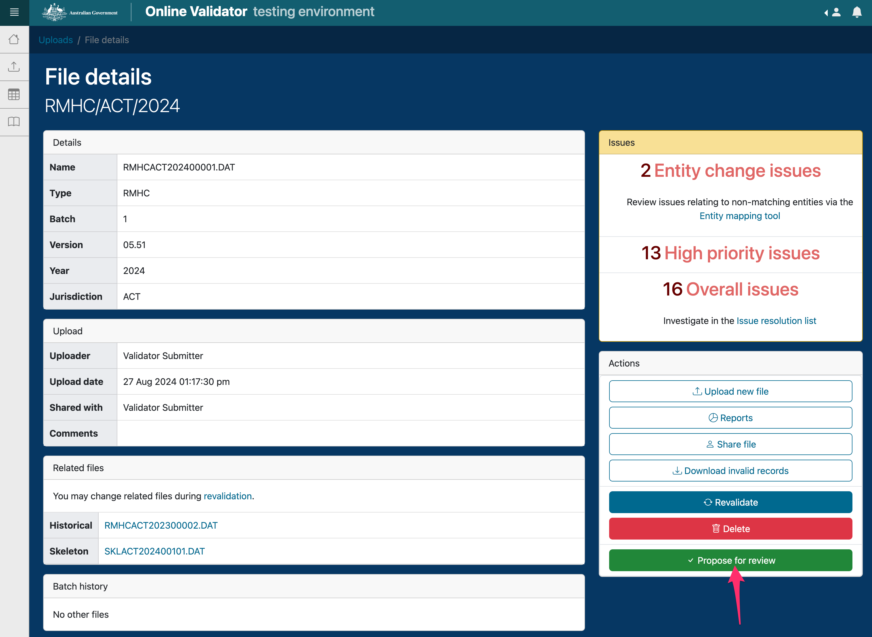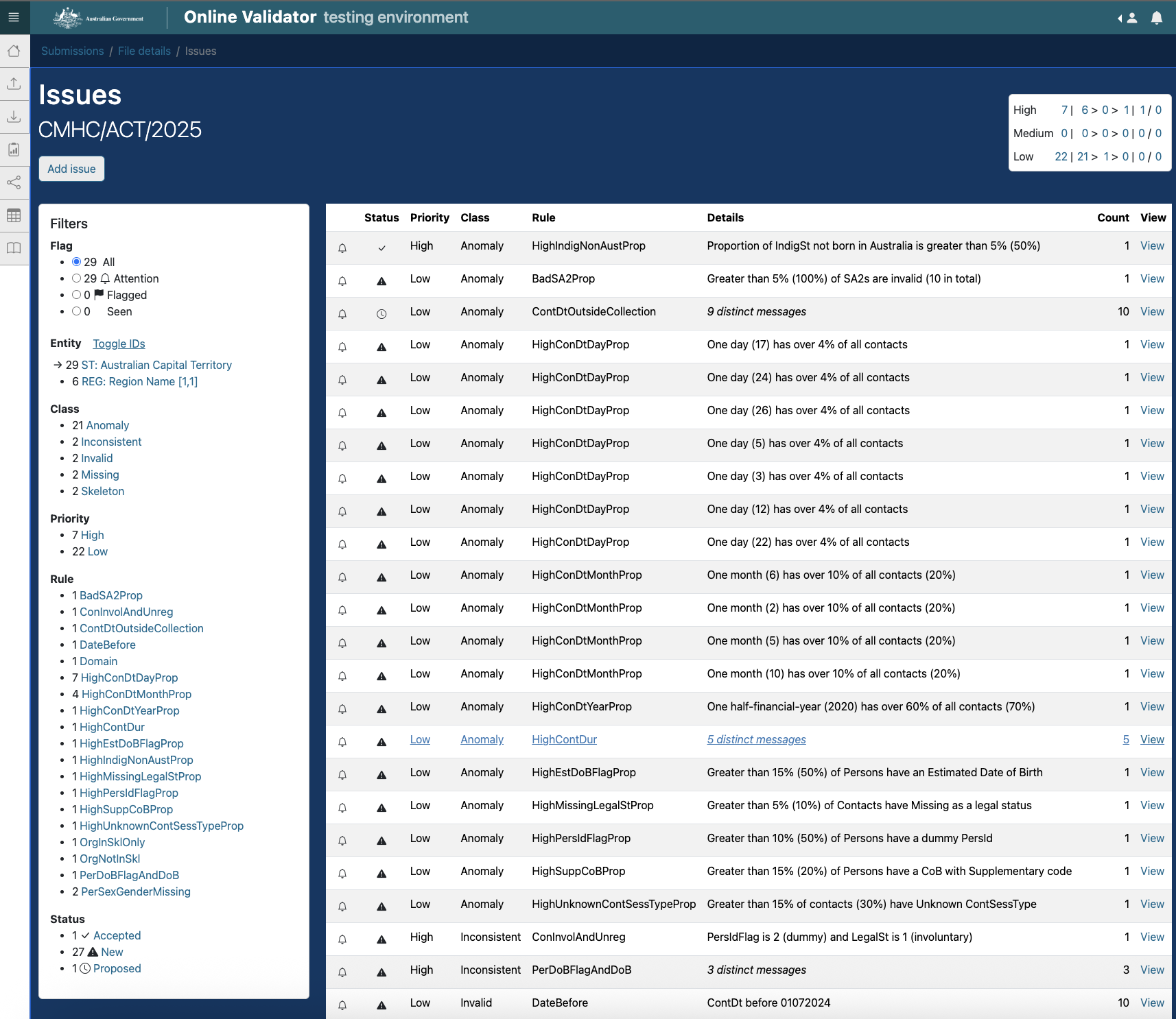 The Online Validator provides two types of validation: record integrity validation and consistency validation. Record integrity validation issues may prevent a file from being proposed; please see Record integrity report for more information.
