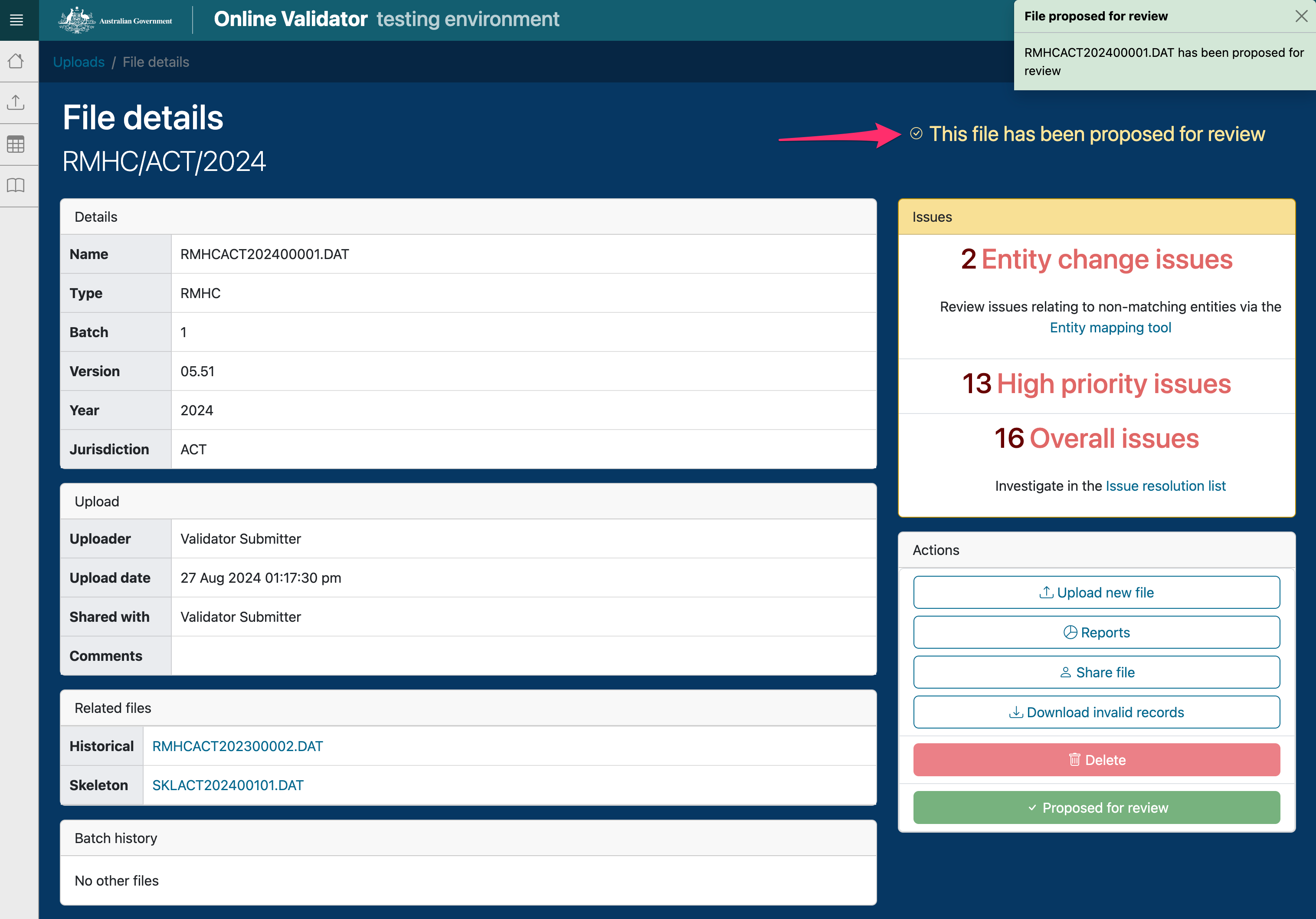 If a file is rejected, control reverts to the Submitter, who is notified that a new file upload is required. Rejection of a file recommences the submission process. Submitters are unable to upload a file that has previously been proposed for review.